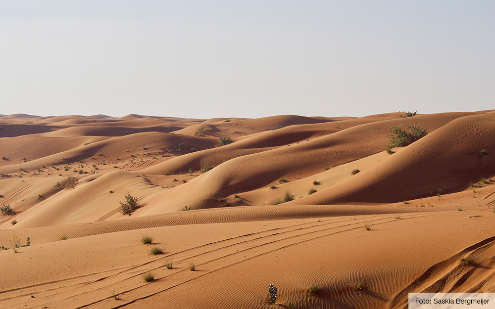Overal waar je kijkt zie je zand, maar nog nooit ben je er zo bewust van geweest dat deze grondsoort zo fascinerend mooi is. Dieporanje gekleurde zandkorrels bekleden de oneindige grond van Dubai tot ze worden onderbroken door grote heuvels aan de horizon. Op elke top van een duin zit een scherpe, rechte lijn waar vaag sporen van andere jeeps in staan. De woestijn van Dubai is een speeltuin, maar wel de mooiste speeltuin op de aarde.