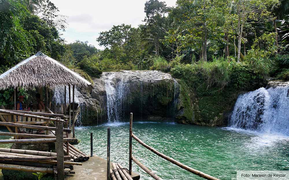 Verstopt achter het houten hutje klettert van alle kanten water van de kliffen naar beneden dat zich verzamelt in een onwerkelijk turquoise lagune. Hoge palmen sieren de rotswanden en laten precies genoeg ruimte over voor de zon om er tussendoor te spieken. Houten bamboebruggen brengen je naar het water, waar enkel een Filipijns jongetje aan het spelen is.