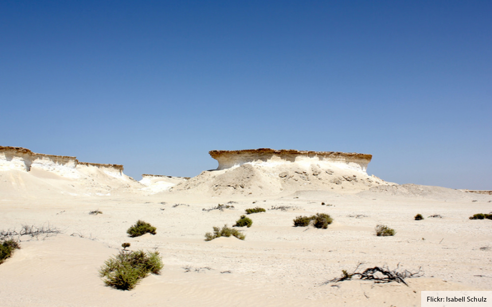 Bir Zekreet ligt in het noordwesten van Qatar, ver van de hysterische en moderne hoofdstad Doha. Het eeuwenoude gebied kenmerkt zich door de bijzondere kalkstenen sculpturen die je adem wegneemt. Over de jaren heen heeft de harde zeewind het zachte zand doen wegwaaien. Nu staan alleen nog de imposante skeletten van kalksteen overeind.