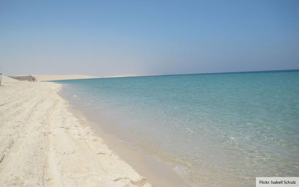 Aan het einde van de dag stap je weer in de auto, nu richting de kust. De azuurblauwe Perzische Golf staat in groot contrast met de droge en lichte vlaktes van het land. De zee wordt heen en weer geschud door de harde wind. Kitesurfers deinzen op de golven van Zekreet West Beach en paragliders sieren de lucht als vliegers. Je neemt een duik in het verkoelende water terwijl de zon het onherbergzame gebied dieporanje kleurt.