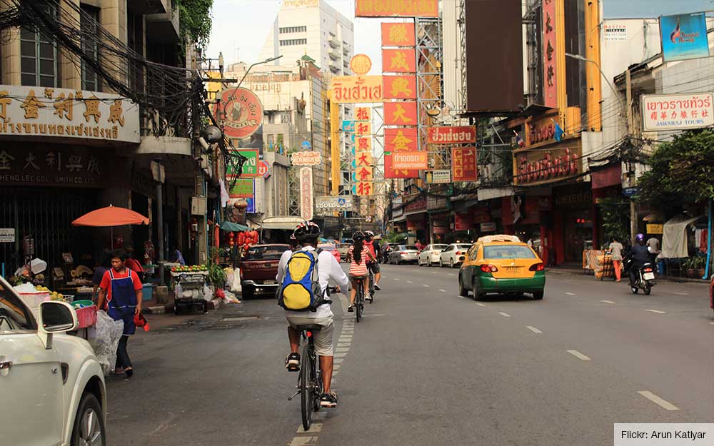 Natuurlijk duik je niet de zee van taxi’s en toektoeks in met je kleintje achterop: je fietst door de relatief rustige wijk Dusit. Denk aan smalle steegjes die uitkomen op de plaatselijke fruitmarkt en de kleinere Thaise tempels. Met de fiets kom je op plekken waar je normaal gesproken niet langs zou komen én bepaal je zelf het tempo.