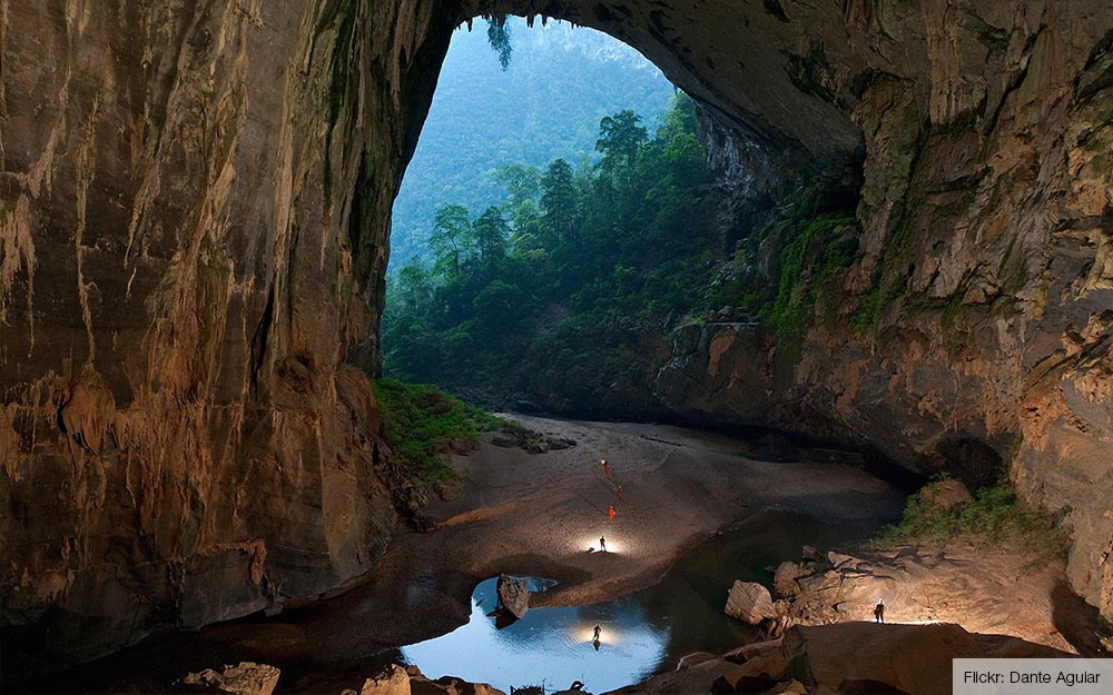 De Song Doong-grot in het Phong Nha-Ke Bang National Park is met haar 5.000 meter lengte en 180 meter hoogte de grootste grot ter wereld. En de meest bijzondere. Door de grot stroomt een grote rivier die wordt verlicht door zonnestralen die naar binnen schijnen op de plekwaar de grot is ingestort. Door deze combinatie heeft zich een tropisch regenwoud gevormd, midden in de grot.